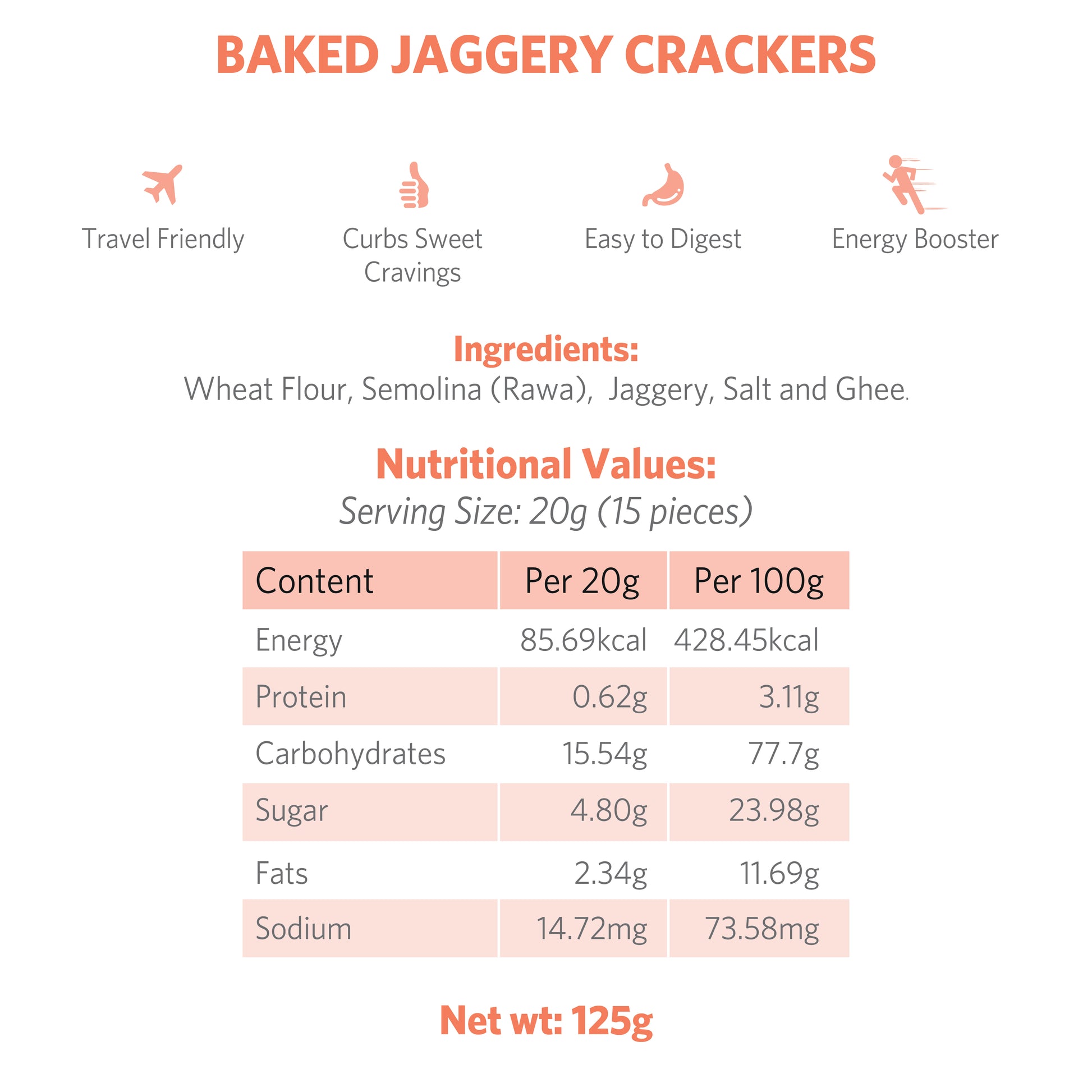 A wholesome twist on snacking, our Baked Jaggery Crackers are light, crunchy, and packed with goodness. Made with the simplest ingredients β wheat flour, rawa, jaggery, a touch of salt, and pure ghee β they bring you the perfect balance of taste and nutrition. The natural sweetness of jaggery adds a comforting flavor, while baking (not frying) makes them guilt-free.